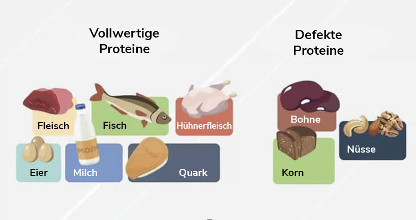 Vollständige Proteine sind solche, die die acht essentiellen Aminosäuren enthalten. Sie kommen in der größten Menge im Eigelb von Hühnereiern, Fleisch, Fisch, Milch und Milchprodukten vor.